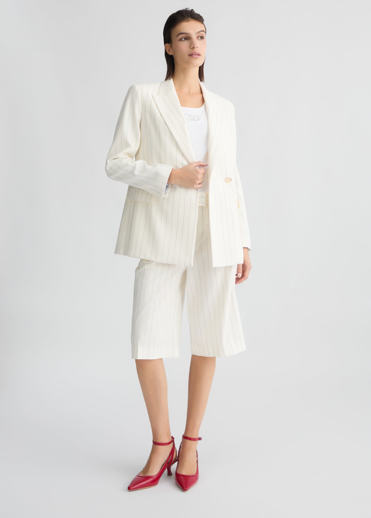 Taglio sartoriale con un elegante trama gessata su sfondo bianco latte: questo blazer è pronto per accompagnarti dai meeting di lavoro ai vernissage pomeridiani. Sceglilo in coordinato con i bermuda per un total lool super glam.