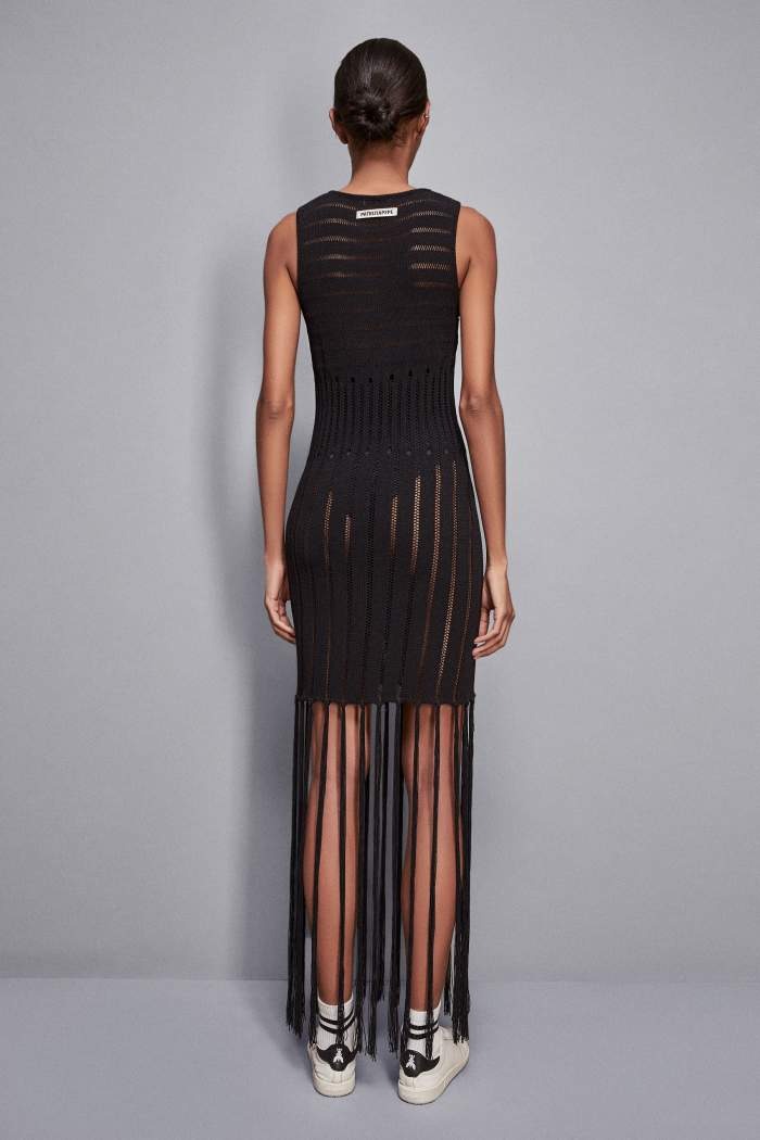 Seducente e dinamico, l'abito traforato in maglieria accarezza elegantemente la silhouette con una vestibilità slim e dettagli unici: frange applicate a mano, lavorazione traforata e sottoveste coordinata.