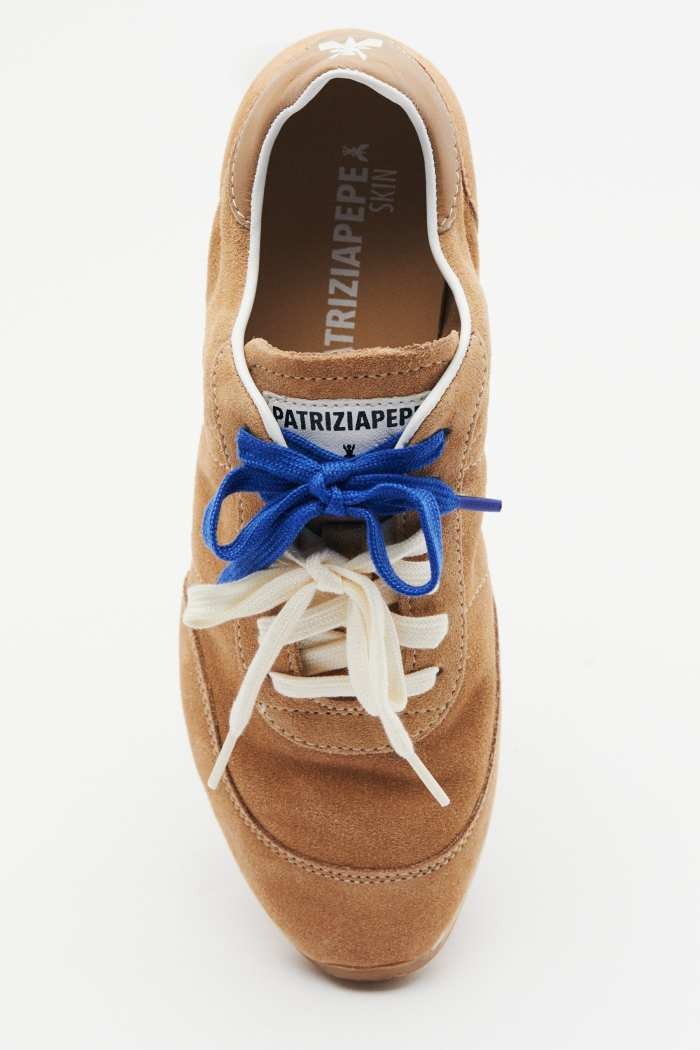 Logo stampato sull'etichetta in pelle cucita sulla linguetta logo Fly stampato sul retro suola beige con scritta Patrizia Pepe Skin e Fly bianca