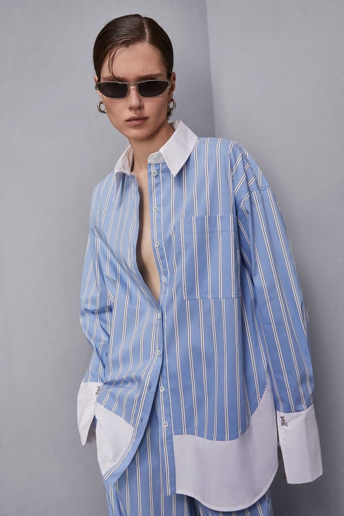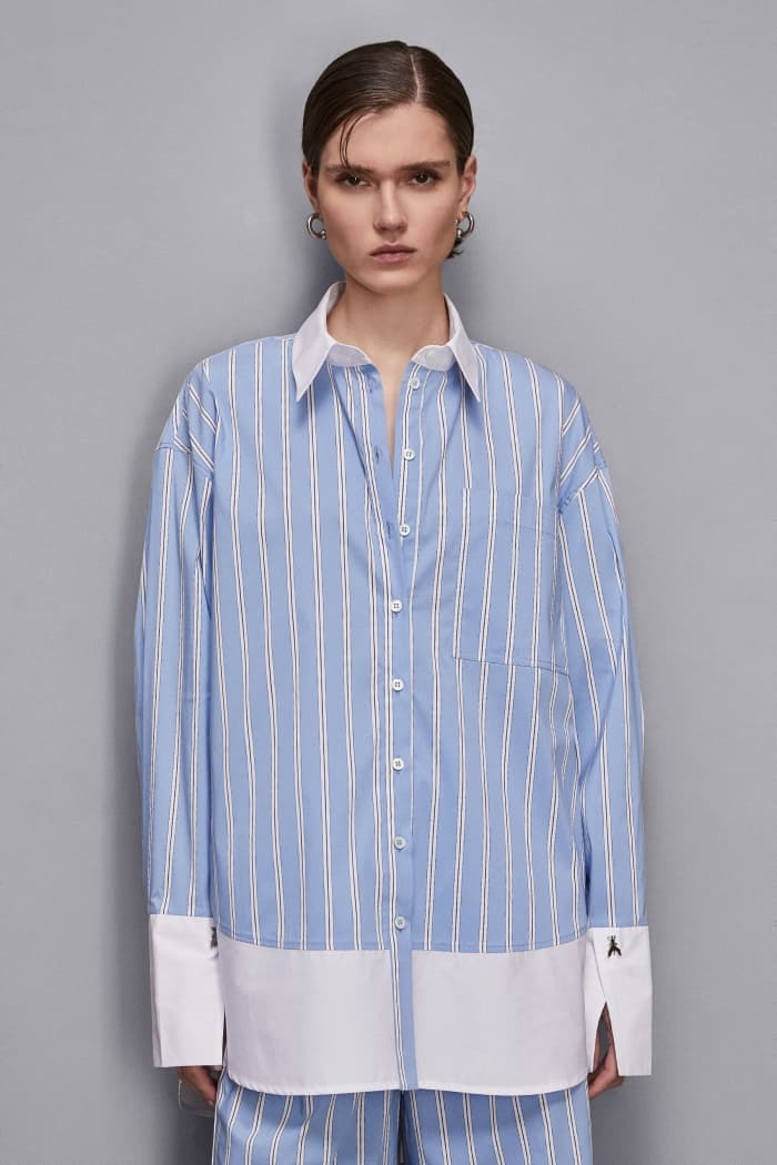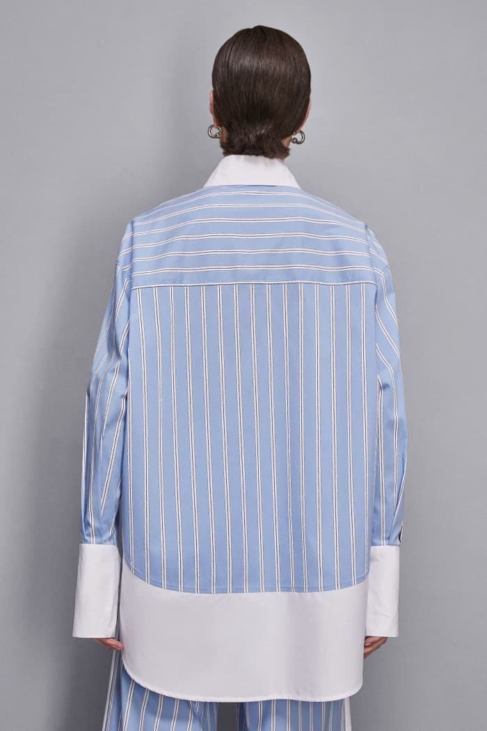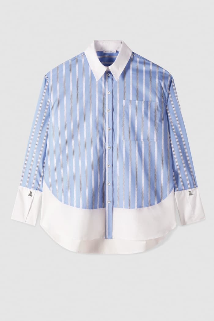 Scopri l'eleganza senza tempo di questa camicia in popeline di cotone, impreziosita da un raffinato mix di tessuti a righe e tinta unita. La vestibilità ampia offre un look rilassato, mentre i rivetti Fly sui polsi aggiungono un tocco di stile distintivo. Perfetta per chi cerca comfort e personalità in un capo versatile e moderno.