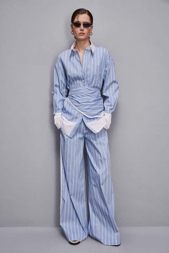 Dettaglio mix di tessuti: a righe e a tinta unita