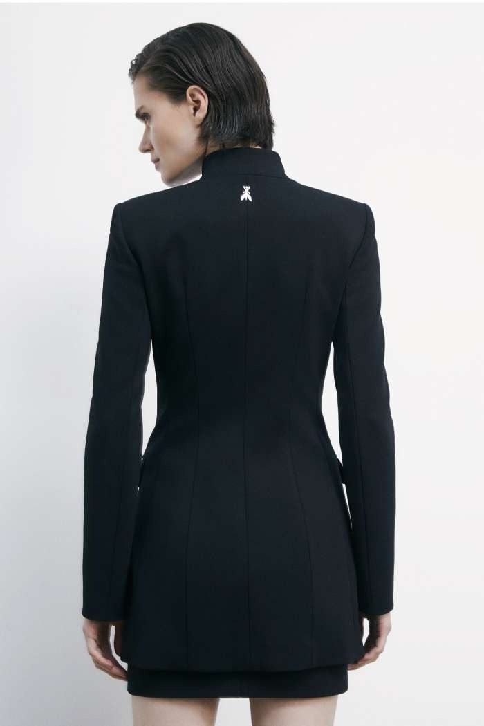 Lo spirito officer di Patrizia Pepe si reinventa nei volumi essenziali della giacca aderente con collo alla coreana in punto stoffa stretch. Strutturata e dal design scultoreo, avvolge la silhouette con grinta. Pensata in total look con la mini gonna coordinata, crea un look statement dove maschile e femminile si fondono in un gioco di contrasti glamour.