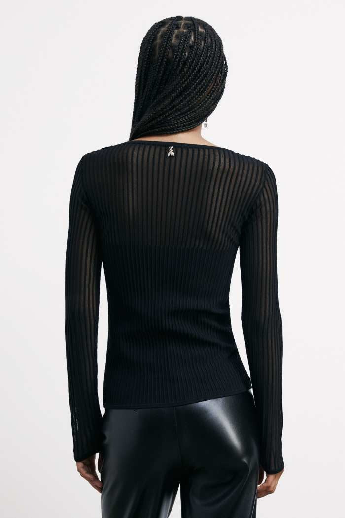 Maglia finissima a costine, lavorata con maestria per un sofisticato effetto see-through con trasparenze sensuali e dettagli grintosi, modellando la silhouette come un corpetto. Perfetta come layer per outfit invernali, si abbina a capi in tessuto spalmato per look glam rock ma anche sotto giacche over per un contrasto deciso.