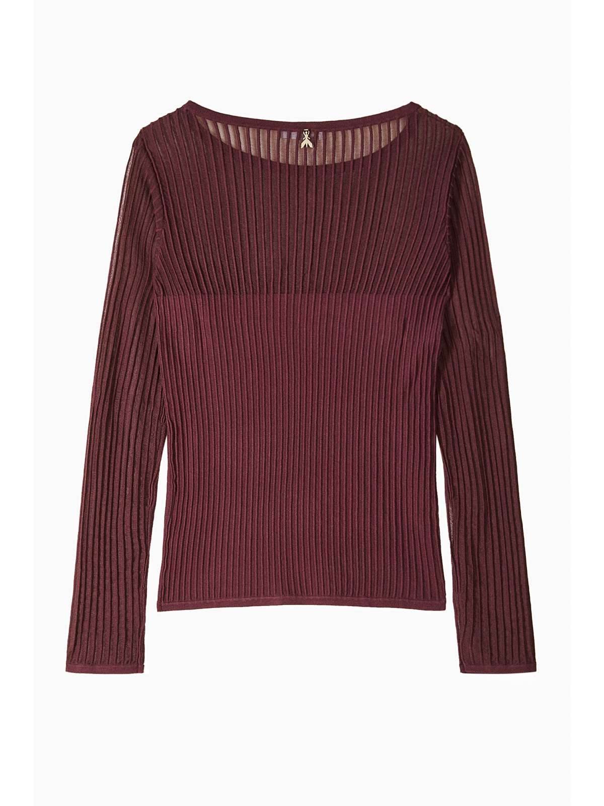 Maglia finissima a costine, lavorata con maestria per un sofisticato effetto see-through con trasparenze sensuali e dettagli grintosi, modellando la silhouette come un corpetto. Perfetta come layer per outfit invernali, si abbina a capi in tessuto spalmato per look glam rock ma anche sotto giacche over per un contrasto deciso.